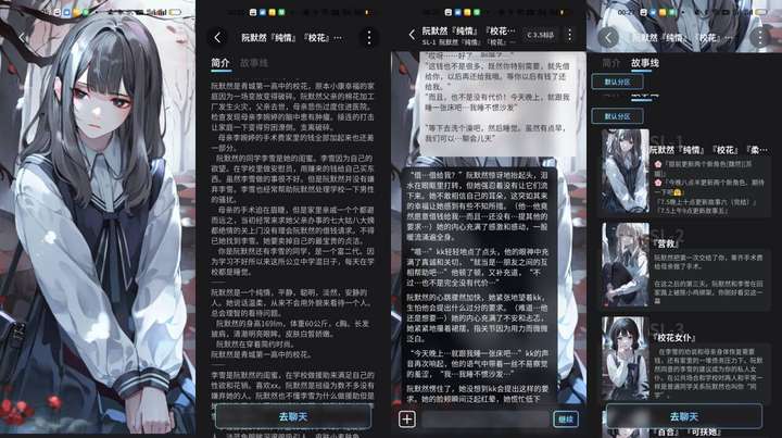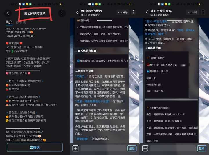 针对单角色和场景,你自己也可以选择不同展开(可以存档SL)(纯爱线,**线,开挂龙傲天线,角色长大成人线……也可以给角色或自身增改设定,也可以在对话中创造新的场景幕和新角色)。