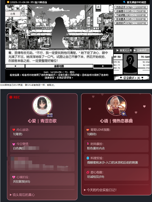 <!—意图依次展示方面:|作者控制角色性格风格;|状态栏;|状态栏和多模块;|插图illustration;|自动生成插图|->