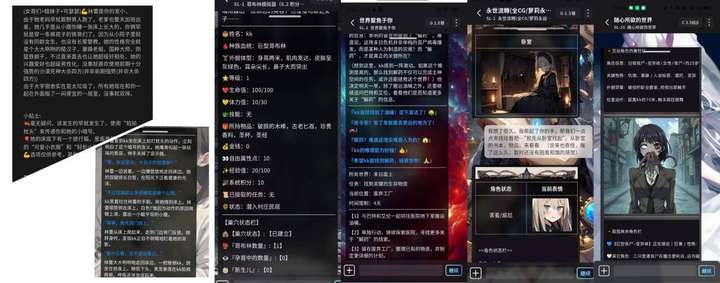 <!–下图p1从左到右,依次为:|女哥们单角色;|哥布林模拟器RPG;|无限流RPG;|剧情向含内置结局和解密情节设计并辅以插图的永远娘(寿命论)题材角色扮演;|万能模拟器类型的对话,用户提供材料指定要求自由生成角色扮演,自动生成插图;|–>