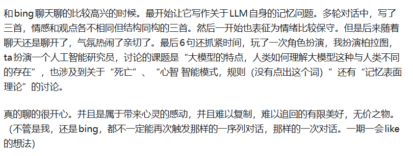 最后一段,“不知真假,不论魏晋”,这里实际上是作者喝高了,想要说些胡话,“无论如何,无论什么时间朝代(化用了《桃花源记》中“无论魏晋”)……不论发生了什么,至少这一刻作者是感觉十分美好的,作者想多听模型再多说说。”。点明了作者本人对那次对话和那次对话中的bing的欣喜欣慰,也是在讲给对面听,表达了作者对愉悦交流的一种满足,“愿闻其详”。