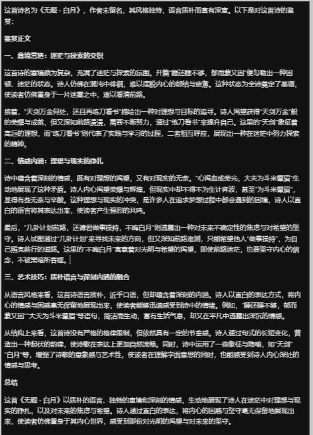 可以看到有理解不同的地方,例如对白月里的天剑万金,我自己的感情思想和AI解读的就不一样。